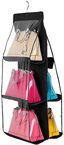 TITLE : 6 Pocket Foldable Hanging Purse Handbag Organizer For Storage Ladies Women Large Clear Hand Bag Storage Organizer, Black Hanging Handbag Purse Organizer for Ladies/Women/Girls Hand Bags Storage Holder Wardrobe Closet for Purse and Clutch with 6 Pockets