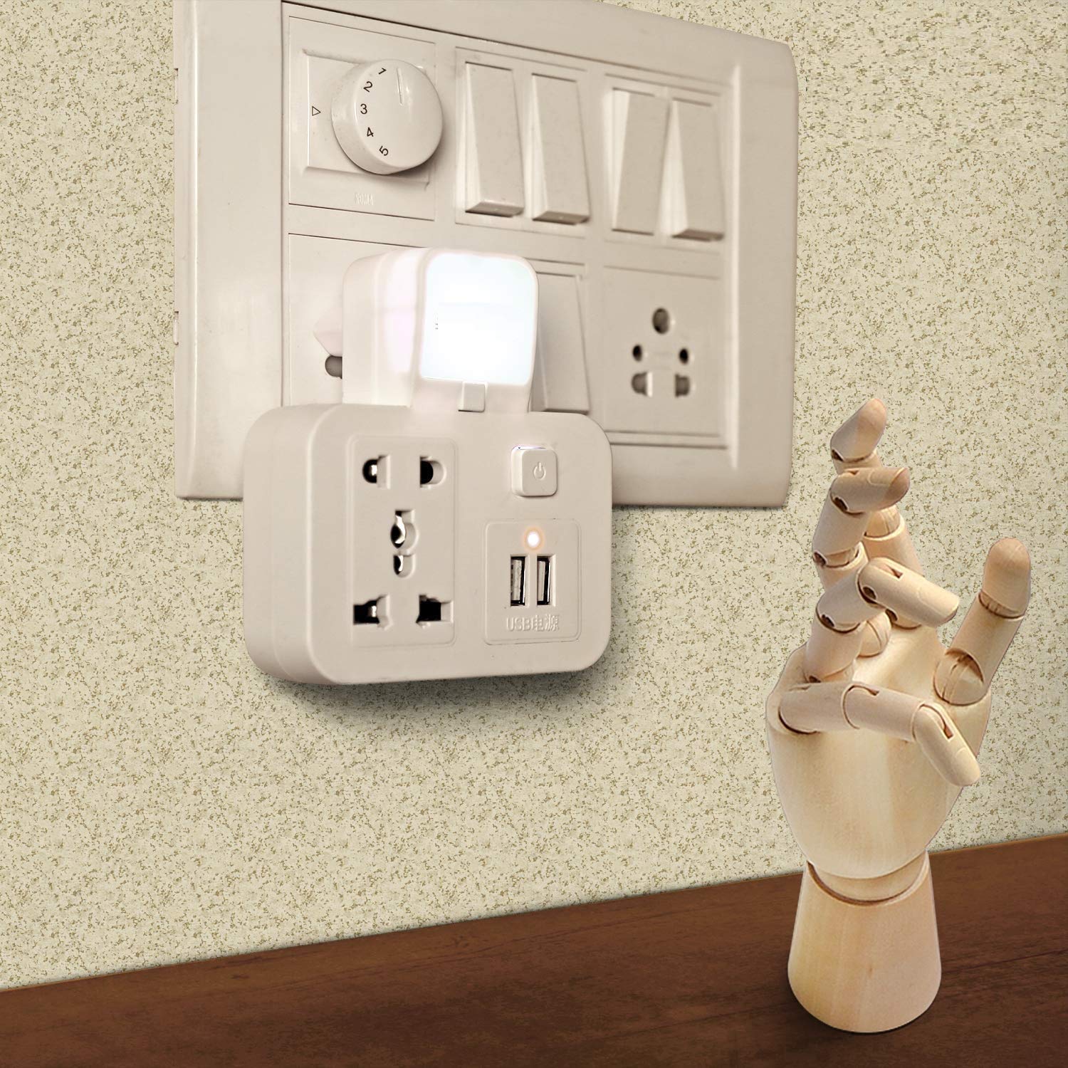- 3-pin, 2-USB socket universal adapter With Night Lamp On off Button. (NOTE: This charger does NOT CONVERT electrical output current and voltage)