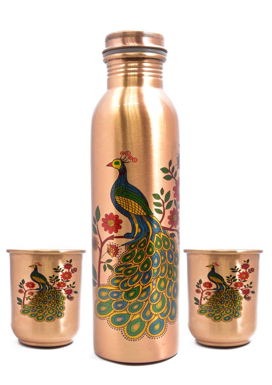 TITLE : Peacock Printed Copper Water Bottles 1 Litre Best 1000 ml Bottle + Copper Glasses 250ml Each (Set 0f 2) Copper Water Bottle 1000 ml Printed Copper Water Bottle for Gym, Office Use and Ayurvedic Health Benefits Vessel with Leak Proof and Glossy Finish Copper Water Bottle with 2 Glasses Peacock Printed